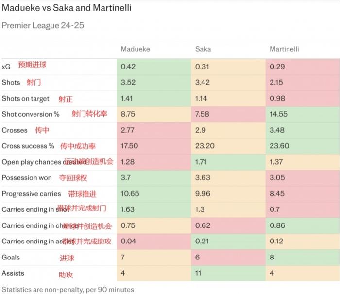 马杜埃凯、萨卡、马丁内利上赛季英超场均数据对比